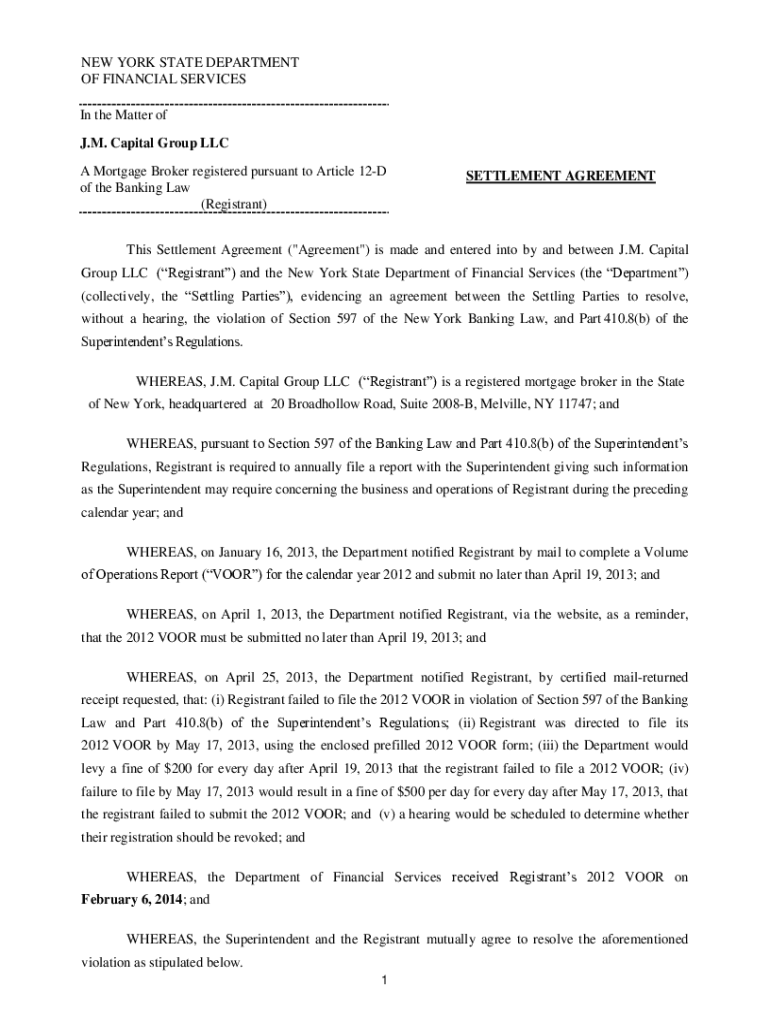 NEW YORK STATE DEPARTMENT OF FINANCIAL SERVICES In the Matter of J.M. Capital Group LLC A Mortgage Broker registered pursuant to Article 12D of the Banking Law (Registrant)SETTLEMENT Agreements Settlement