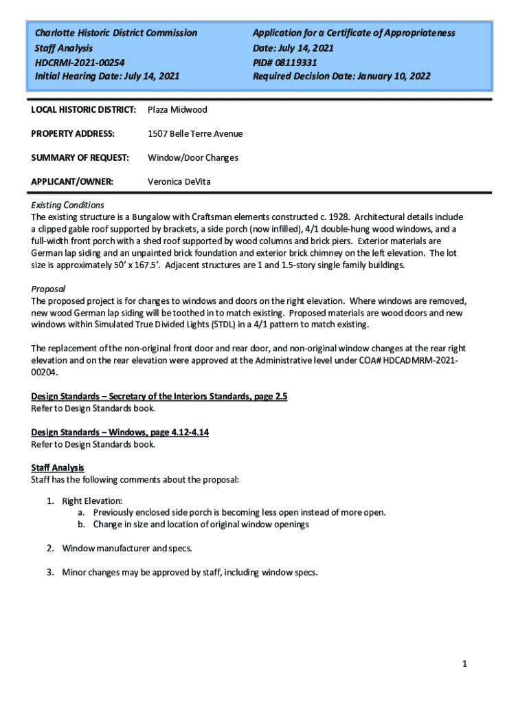 Charlotte Historic District Commission Staff Analysis HDCRMI202100254 Initial Hearing Date: July 14, 2021, LOCAL HISTORIC DISTRICT:Plaza MidwoodPROPERTY ADDRESS:1507 Belle Terry AvenueSUMMARY OF REQUEST:Window/Door