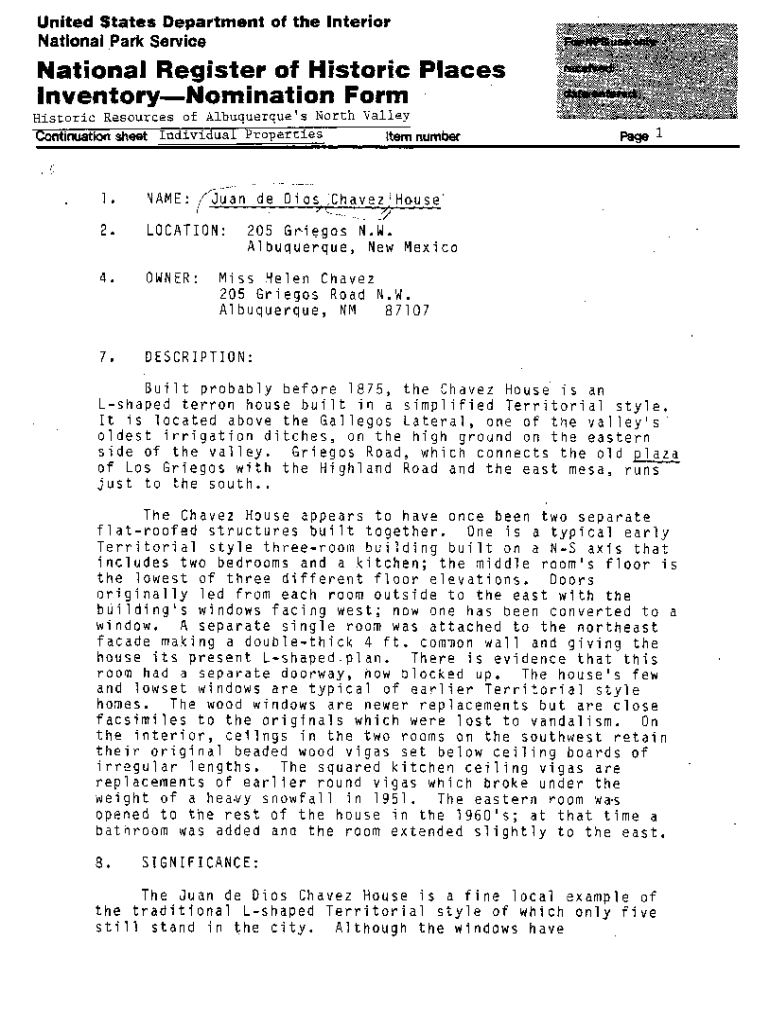 United States Department of the Interior National Park ServiceNational Register of Historic Places InventoryNomination Form Historic Resources of Albuquerque\'s North ValleyContinuation sheet Individual