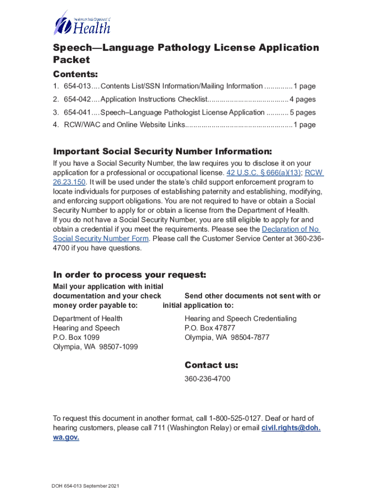 SpeechLanguage Pathology License Application Packet Contents: 1. 654013..... Contents List/SSN Information/Mailing Information...............1 page 2. 654042..... Application Instructions Checklist........................................
