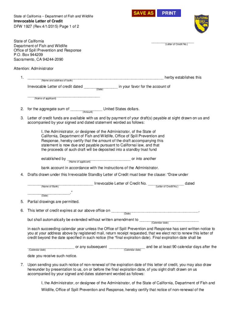 PRINTS AVE Asst ate of California Department of Fish and WildlifeIrrevocable Letter of Credit DFW 1927 (Rev.4/1/2015) Page 1 of 2State of California Department of Fish and Wildlife Office of Spill