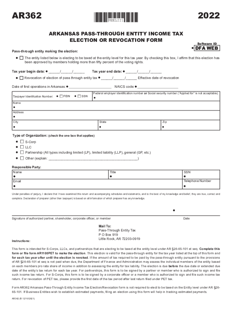 PRINT FORMAR362CLEAR FORM2022PEEL221ARKANSAS WALKTHROUGH ENTITY INCOME TAX ELECTION OR REVOCATION FORMSoftware ID DFA WEBPassthrough entity making the election:7KHHQWLWOLVWHGEHORZLVHOHFWLQJWREHWD×HGDWWKHHQWLWOHYHOIRUWKLVWD×HD×FKHFNLQJWKLVER[,