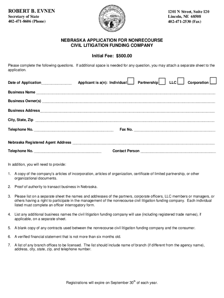ROBERT B. EVNEN1201 N Street, Suite 120 Lincoln, NE 68508 4024712530 (Fax)Secretary of State 4024718606 (Phone)NEBRASKA APPLICATION FOR CONCOURSE CIVIL LITIGATION FUNDING COMPANY Initial Fee: $500.00