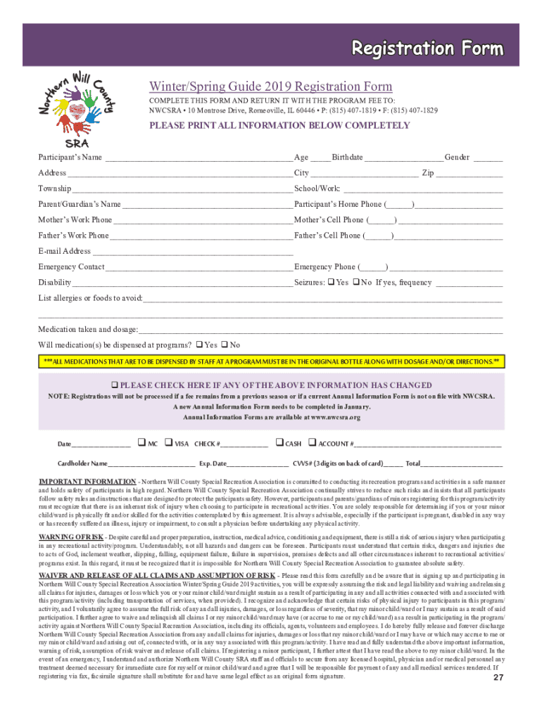 Registration Form Winter/Spring Guide 2019 Registration Form COMPLETE THIS FORM AND RETURN IT WITH THE PROGRAM FEE TO: NASA 10 Montrose Drive, Romeoville, IL 60446 P: (815) 4071819 F: (815) 4071829PLEASE