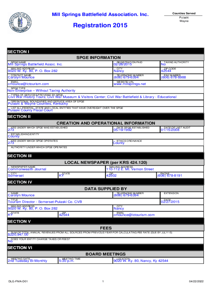 Counties Served Mill Springs Battlefield Association. Inc. Pulaski WayneRegistration 2015SECTION IS PGE INFORMATION SAGE PREREGISTRATION PAID Mill Springs Battlefield Assoc. Inc.02/26/2015MAILING