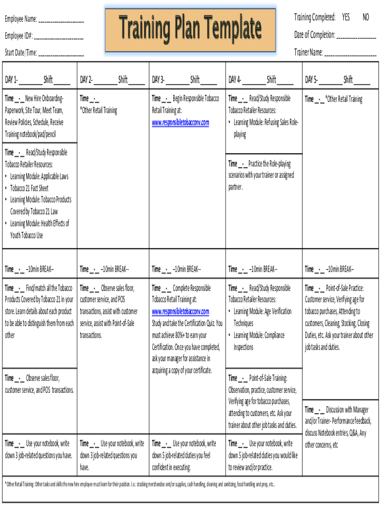 Employee Name: ___ Employee ID#: ___ Start Date/Time: ___Training Plan TemplateTraining Completed:Renovate of Completion: ___ Trainer Name: ___DAY 1 ___ Shift ___DAY 2 ___ Shift ___DAY 3 ___ Shift