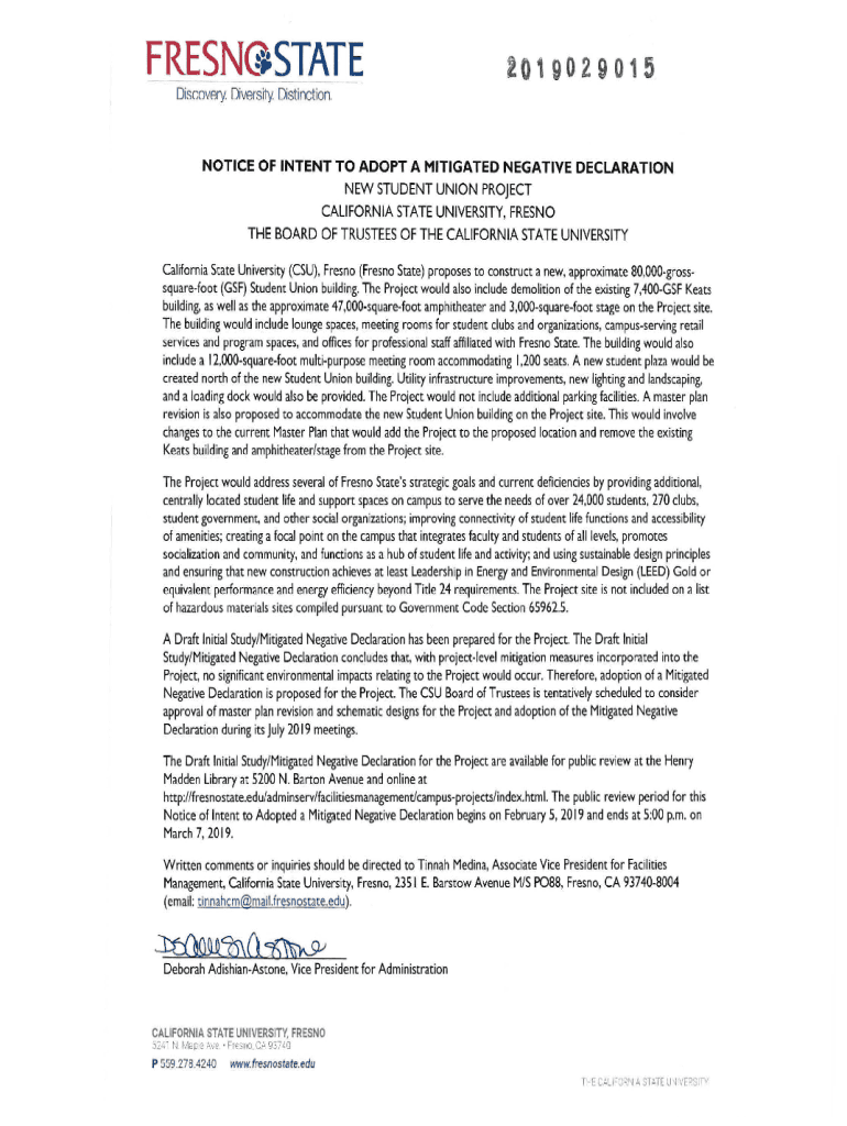 FRESNGSTATE2019029015Discovery. Diversity. Distinction.NOTICE OF INTENT TO ADOPT A MITIGATED NEGATIVE DECLARATION NEW STUDENT UNION PROJECT CALIFORNIA STATE UNIVERSITY, FRESNO THE BOARD OF TRUSTEES