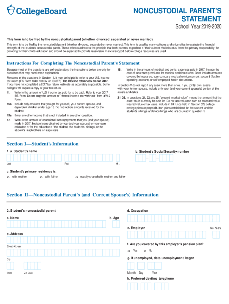 NONCUSTODIAL PARENT\'S STATEMENT School Year 20192020 This form is to be filed by the noncustodial parent (whether divorced, separated or never married). This form is to be filed by the noncustodial