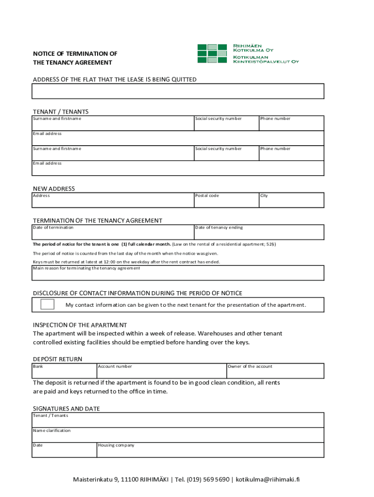 NOTICE OF TERMINATION OF THE TENANCY AGREEMENT ADDRESS OF THE FLAT THAT THE LEASE IS BEING QUITTEDTENANT / TENANTS Surname and firstnameSocial security numberPhone numberSocial security numberPhone