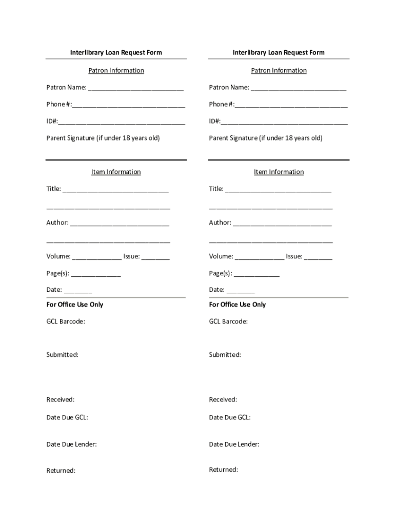 To fill out an interlibrary loan request form, you typically need to provide your name, contact information, the title of the requested item, and the author's name.