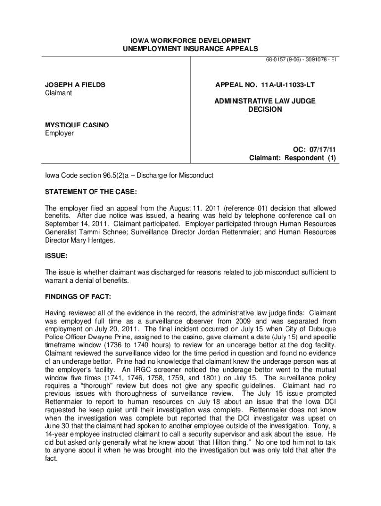 IOWA WORKFORCE DEVELOPMENT UNEMPLOYMENT INSURANCE APPEALS 680157 (906) 3091078 JOSEPH A FIELDS ClaimantAPPEAL NO. 11AUI11033LT ADMINISTRATIVE LAW JUDGE DECISIONMYSTIQUE CASINO Employer OC: 07/17/11