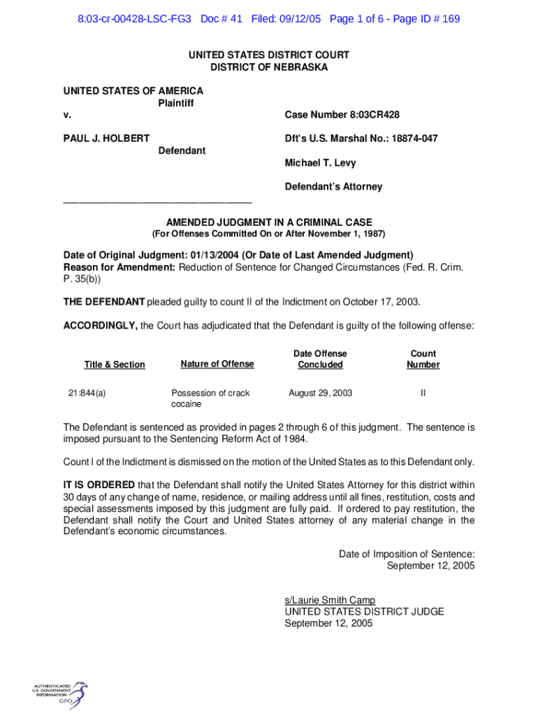 8:03cr00428LSCFG3 Doc # 41 Filed: 09/12/05-Page 1 of 6-Page ID # 169 UNITED STATES DISTRICT COURT DISTRICT OF NEBRASKA UNITED STATES OF AMERICA Plaintiff v. Case Number 8:03CR428PAUL J. HOLBERTDfts