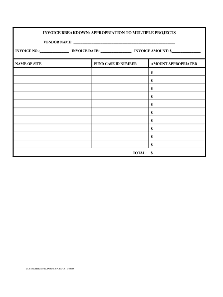 INVOICE BREAKDOWN: APPROPRIATION TO MULTIPLE PROJECTS VENDOR NAME: ___ INVOICE NO.:___ INVOICE DATE: ___ INVOICE AMOUNT: $___NAME OF SITED CASE ID NUMBERAMOUNT APPROPRIATED $ $ $ $ $ $ $ $ $ $TOTAL:J:USERS/BRIDGE/FORMS/SPLITCOSTSFORM$
