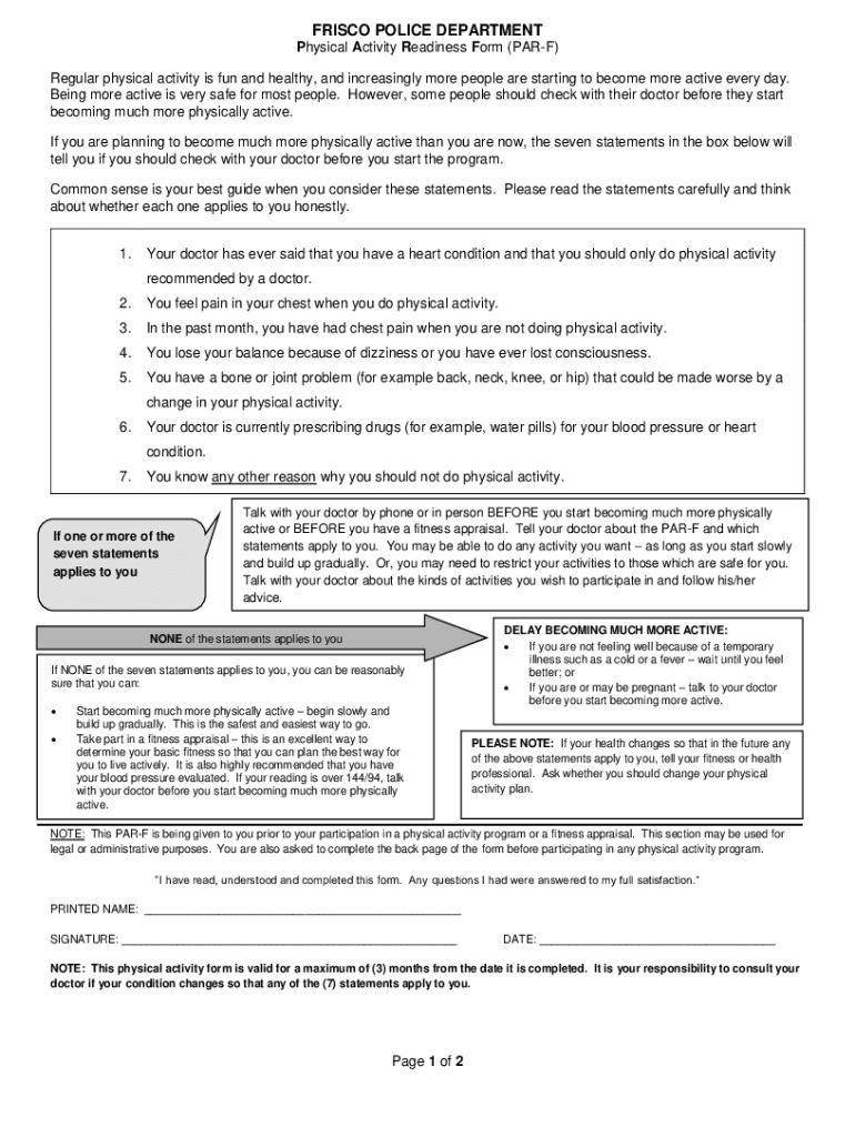 FRISCO POLICE DEPARTMENT Physical Activity Readiness Form (PART) Regular physical activity is fun and healthy, and increasingly more people are starting to become more active every day. Being more
