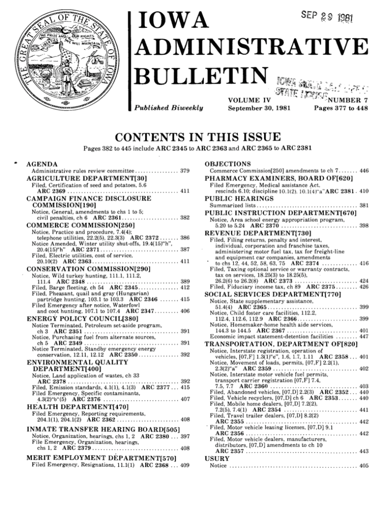 IOWA Sense ADMINISTRATIVE BULLETIN nm JO0RPublished BiweeklyVOLUME IV September 30, 1981NUMBER 7 Pages 377 to 448CONTENTS IN THIS ISSUE Pages 382 to 445 include ARC 2345 to ARC 2363 and ARC 2365 to