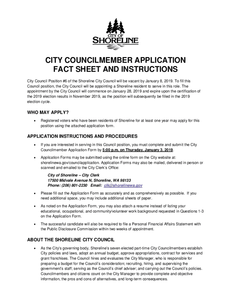 CITY COUNCILMEMBER APPLICATION FACT SHEET AND INSTRUCTIONS City Council Position #6 of the Shoreline City Council will be vacant by January 8, 2019. To fill this Council position, the City Council
