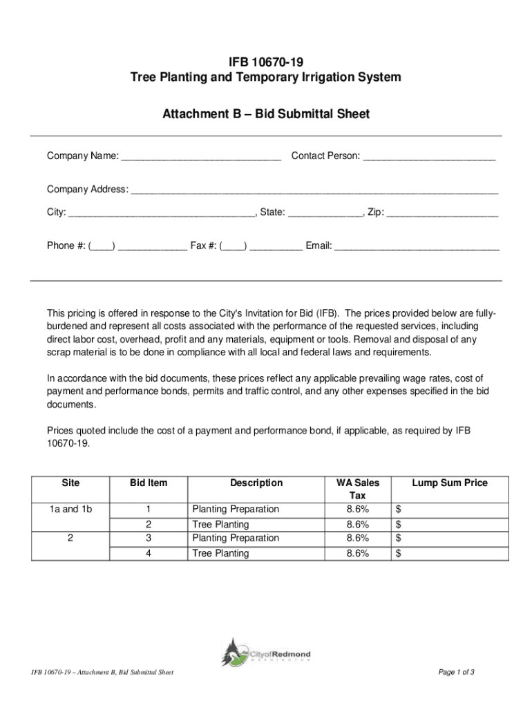 IF 1067019 Tree Planting and Temporary Irrigation System Attachment B Bid Submittal Sheet Company Name: ___Contact Person: ___Company Address: ___ City: ___, State: ___, Zip: ___Phone #: (___) ___