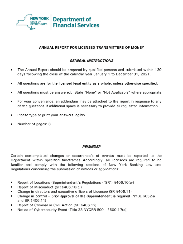 Get the free NYSDFS: 2021 Non-NMLS Money Transmitter Annual Report Form
