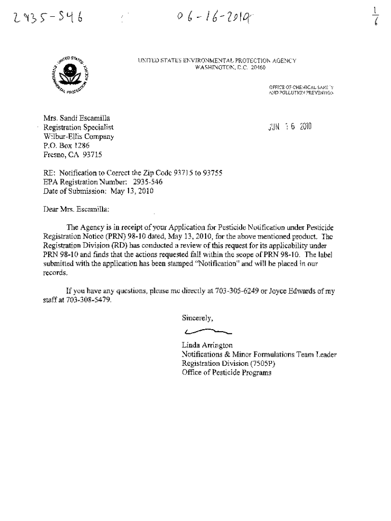 OI (b 16 Up mounted STATES ENVIRONMENTAL PROTECTION AGENCY WASHINGTON, D.C. 20460OFFICE OF Chemical SAFETY AND POLLUTION PREVENTION Mrs. Sand Camilla Registration Specialist Wilbur Ellis Company P.O.