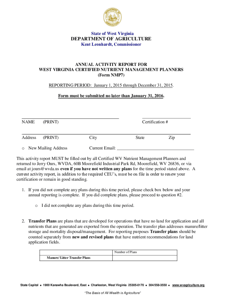 State of West VirginiaDEPARTMENT OF AGRICULTURE Kent Leonard, CommissionerANNUAL ACTIVITY REPORT FOR WEST VIRGINIA CERTIFIED NUTRIENT MANAGEMENT PLANNERS (Form NMP7) REPORTING PERIOD: January 1, 2015,