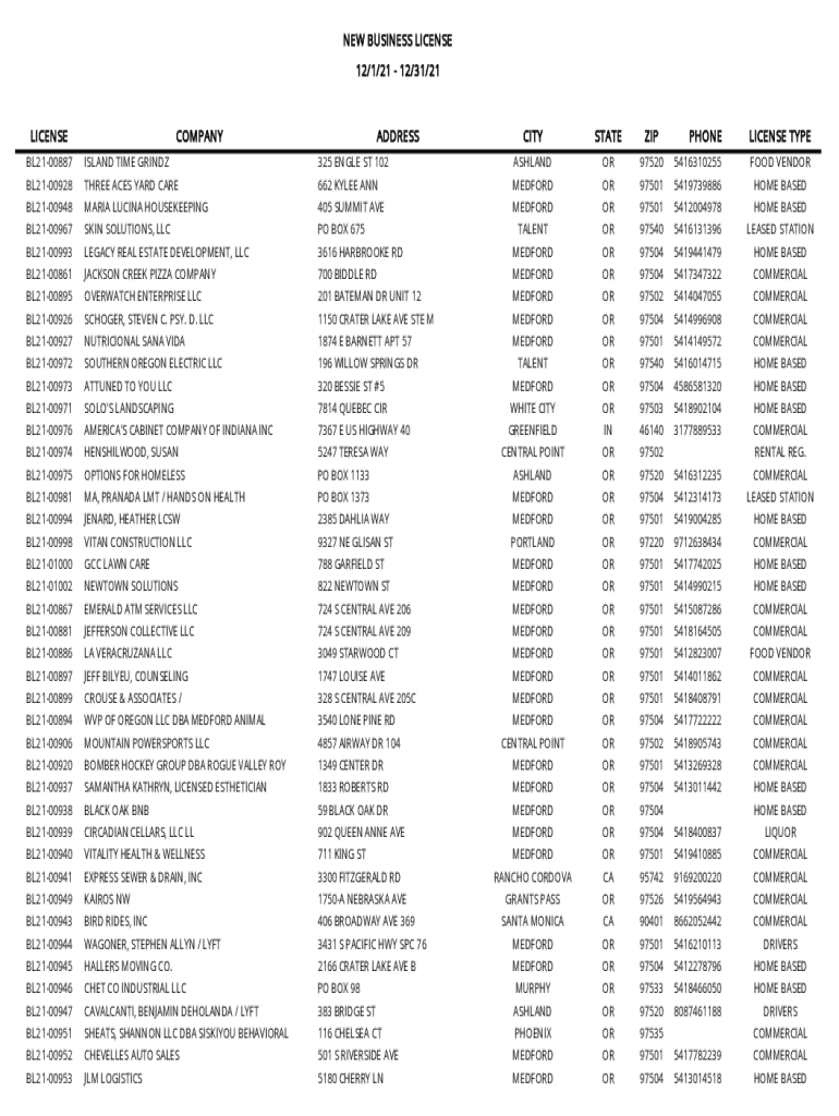 NEW BUSINESS LICENSE 12/1/21 12/31/21CITYSTATEZIPPHONELICENSE TYPEBL2100887LICENSE ISLAND TIME GRINDZCOMPANY325 ANGLE ST 102ADDRESSASHLANDOR975205416310255FOOD VENDORBL2100928THREE ACES YARD CARE662