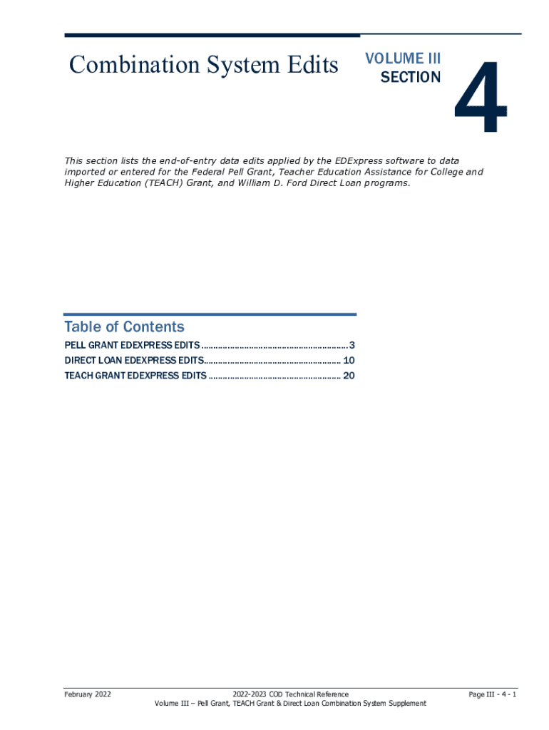 Combination System EditsVOLUME III SECTION4This section lists the indolent data edits applied by the Express software to data imported or entered for the Federal Well Grant, Teacher Education Assistance