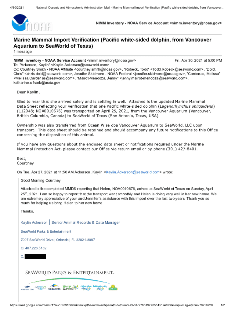 4/30/2021National Oceanic and Atmospheric Administration Mail Marine Mammal Import Verification (Pacific white sided dolphin, from VancouverNIMM Inventory NOAA Service Account DIMM. Inventory@NOAA.gov
