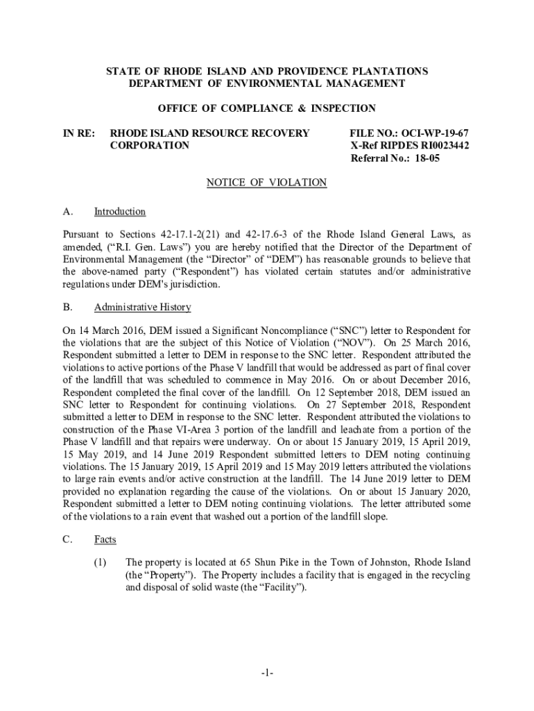 STATE OF RHODE ISLAND AND PROVIDENCE PLANTATIONS DEPARTMENT OF ENVIRONMENTAL MANAGEMENT OFFICE OF COMPLIANCE & INSPECTION IN RE:RHODE ISLAND RESOURCE RECOVERY CORPORATIONFILE NO.: OCIWP1967 Xref RIDES