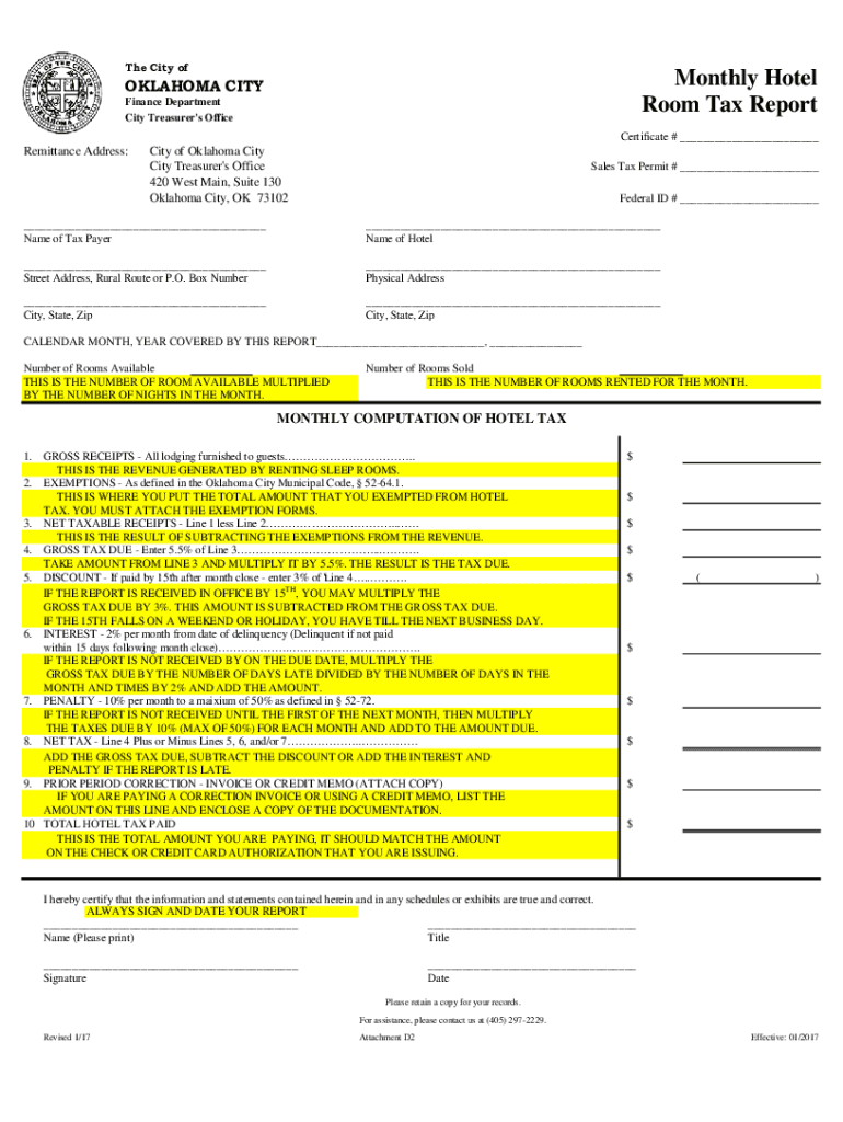 The City monthly Hotel Room Tax ReportOKLAHOMA CITY Finance Department City Treasurer\'s OfficeCertificate # ___Remittance Address:City of Oklahoma City Treasurer\'s Office 420 West Main, Suite 130