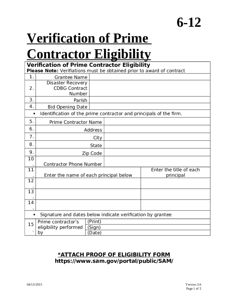 What is www.coursehero.comfile101943809exhibit-6-12-verification-of-prime-contractor-eligibility.doc ... Form?