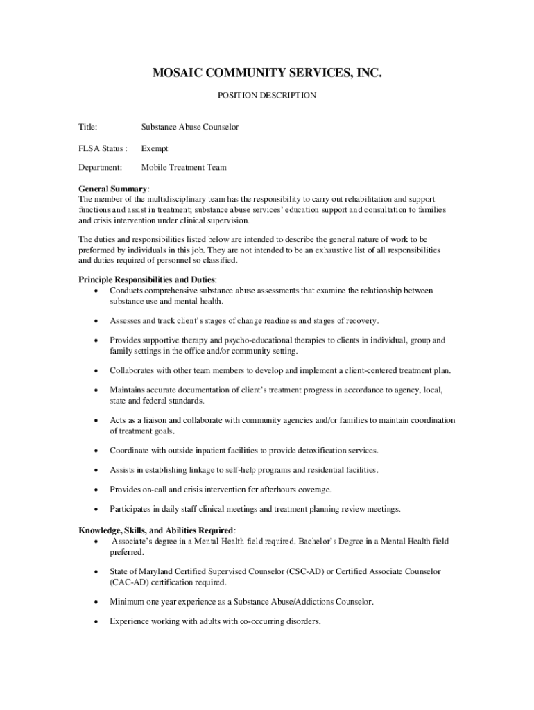 MOSAIC COMMUNITY SERVICES, INC. POSITION DESCRIPTIONTitle:Substance Abuse Counselors Status :ExemptDepartment:Mobile Treatment TeamGeneral Summary: The member of the multidisciplinary team has the