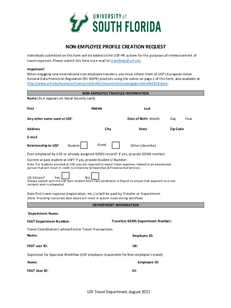 EMPLOYEE PROFILE CREATION REQUEST Individuals submitted on this form will be added to the USF HR system for the purposes of reimbursement of travel expenses. Please submit this form via email to travel