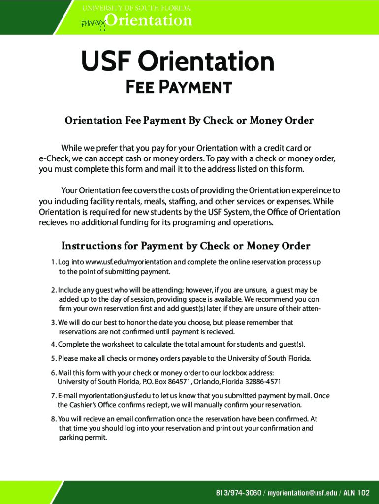 USF Orientation Fee PaymentOrientation Fee Payment By Check or Money Order While we prefer that you pay for your Orientation with a credit card or check, we can accept cash or money orders. To pay
