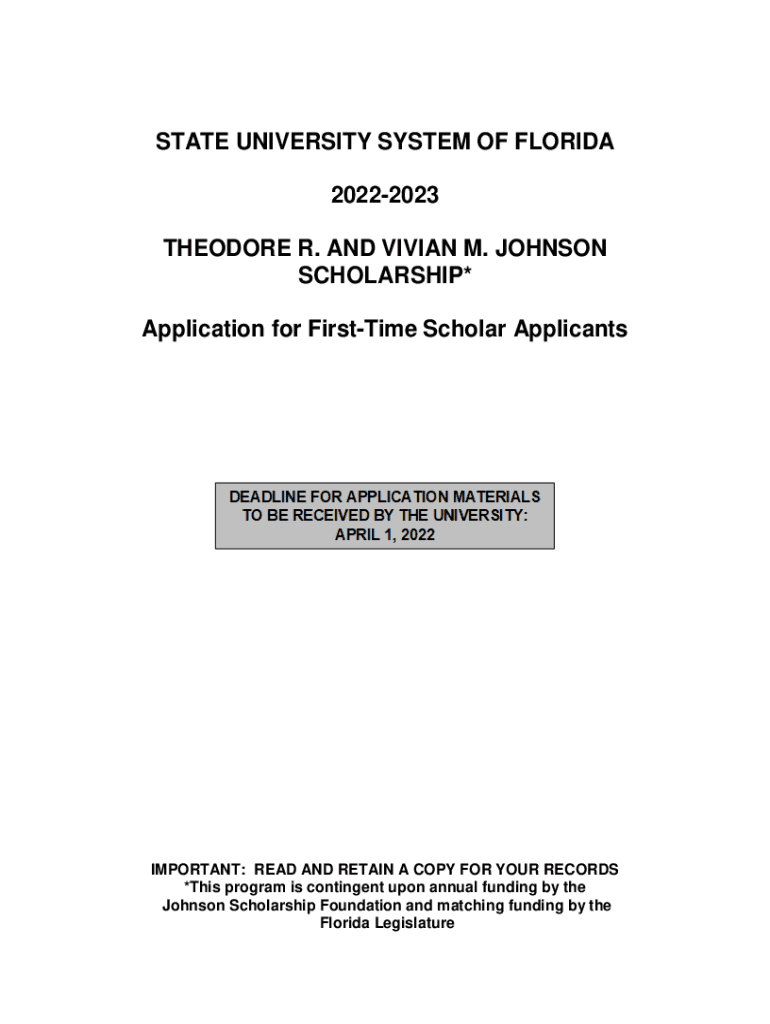STATE UNIVERSITY SYSTEM OF FLORIDA 20222023 THEODORE R. AND VIVIAN M. JOHNSON SCHOLARSHIP* Application for First-time Scholar ApplicantsDEADLINE FOR APPLIED 11ON MATERIALS TO BE RECEIVED BY THE UNIVERSITY: