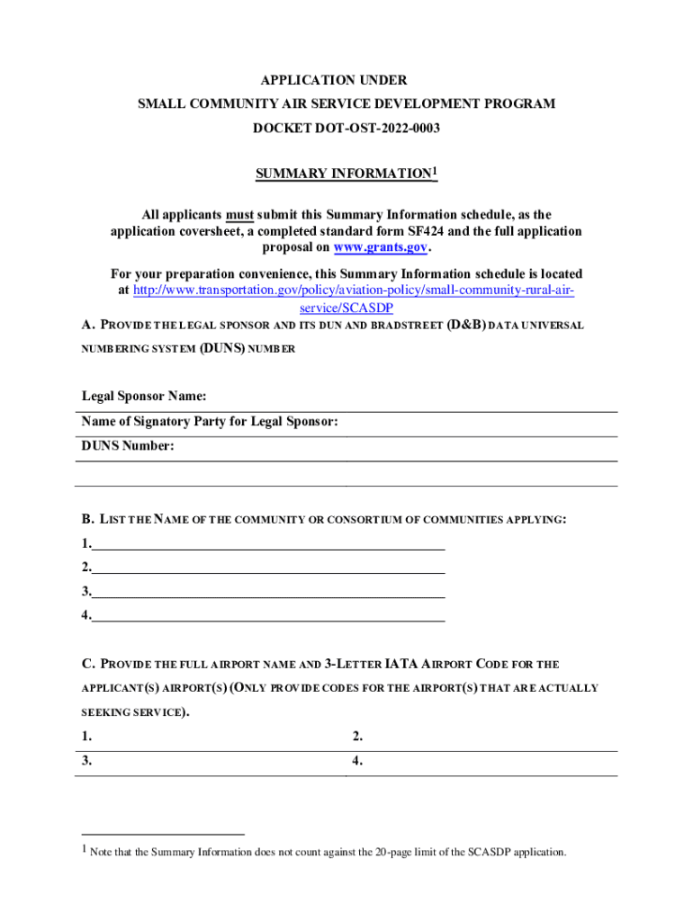 APPLICATION UNDER SMALL COMMUNITY AIR SERVICE DEVELOPMENT PROGRAM DOCKET DOTOST20220003 SUMMARY INFORMATION1 All applicants must submit this Summary Information schedule, as the application cover