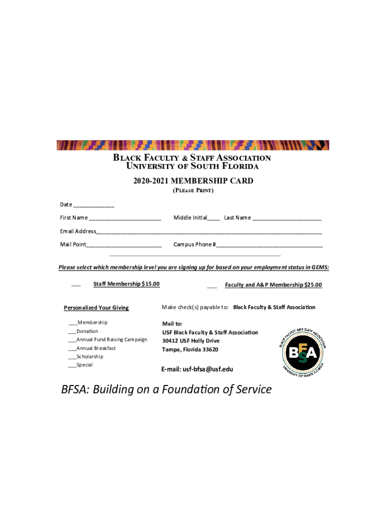 Black Faculty & Staff Association University of South Florida 20202021 MEMBERSHIP CARD (Please Print) Date ___ First Name ___Middle Initial___ Last Name ___Email Address___ Mail Point___Campus Phone
