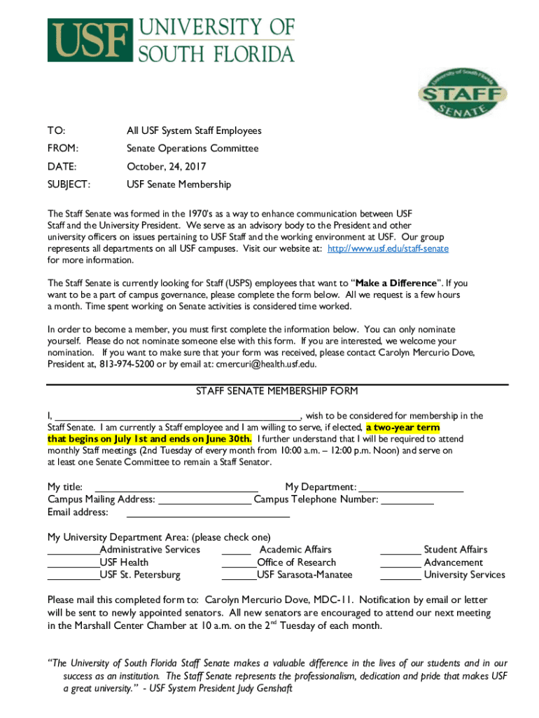 TO:All USF System Staff EmployeesFROM:Senate Operations Committeeman:October, 24, 2017SUBJECT:USF Senate Membership Staff Senate was formed in the 1970s as a way to enhance communication between USF