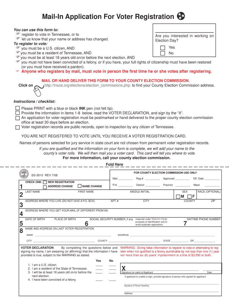 To be eligible, you must be a U.S. citizen, a resident of Tennessee, at least 18 years old, and not currently convicted of a felony without having your voting rights restored.
