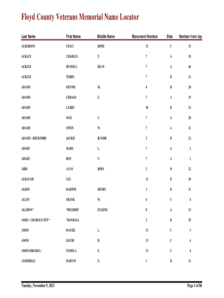 Floyd County Veterans Memo rial Name Locator Last NameFirst NameMiddle NameACKERSONSTACIROTH13C32ACKLEYCHARLEST.7A18ACKLEYRUSSELLDEAN7A46ACKLEYTERRY7B21ADAMSDENNISM.4D20ADAMSGERALDE.7A19ADAMSLARRY10B23ADAMSMAXC.7A20ADAMSOWENW.7A21ADAMS