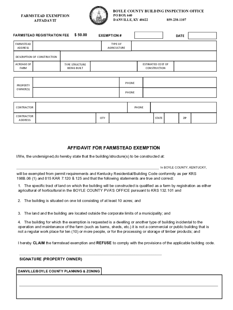 BOYLE COUNTY BUILDING INSPECTION OFFICE PO BOX 640 DANVILLE, KY 40422FARMSTEAD EXEMPTION AFFADAVITFARMSTEAD REGISTRATION FEET 50.008592381107DATEEXEMPTION #FARMSTEAD ADDRESSABLE OF AGRICULTUREDESCRIPTION