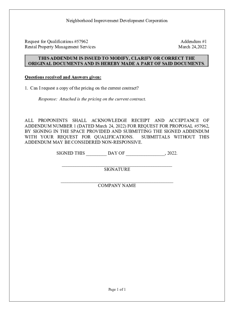 Neighborhood Improvement Development CorporationRequest for Qualifications #57962 Rental Property Management ServicesAddendum #1 March 24,2022THIS ADDENDUM IS ISSUED TO MODIFY, CLARIFY OR CORRECT