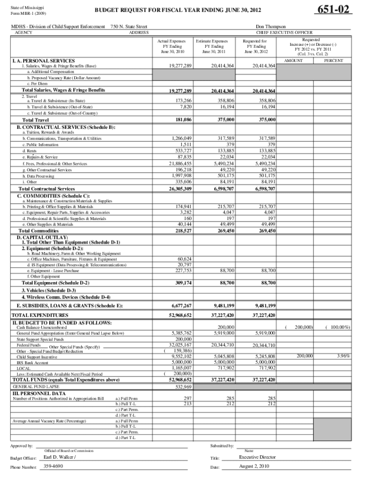 State of Mississippi Form MBR1 (2009)65102BUDGET REQUEST FOR FISCAL YEAR ENDING JUNE 30, 2012MDHS Division of Child Support Enforcement750 N. State StreetAGENCYDon ThompsonADDRESSCHIEF EXECUTIVE OFFICER