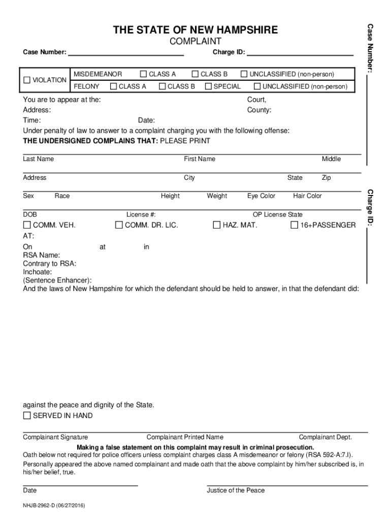 Clear FormCOMPLAINT Case Number:VIOLATIONCharge ID: CLASS MISDEMEANOR FELONYCLASS CLASS UNCLASSIFIED (nonperson)SPECIAL Case Number:THE STATE OF NEW HAMPSHIREUNCLASSIFIED (nonperson)You are to appear