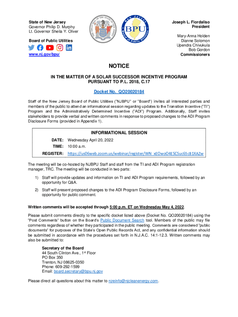 State of New Jersey Governor Philip D. Murphy Lt. Governor Sheila Y. Oliver Joseph L. Formalism President Maryann Holden Dianne Solomon Kendra Chivukula Bob Gordon CommissionersBoard of Public Utilitieswww.nj.gov/bpu/NOTICE