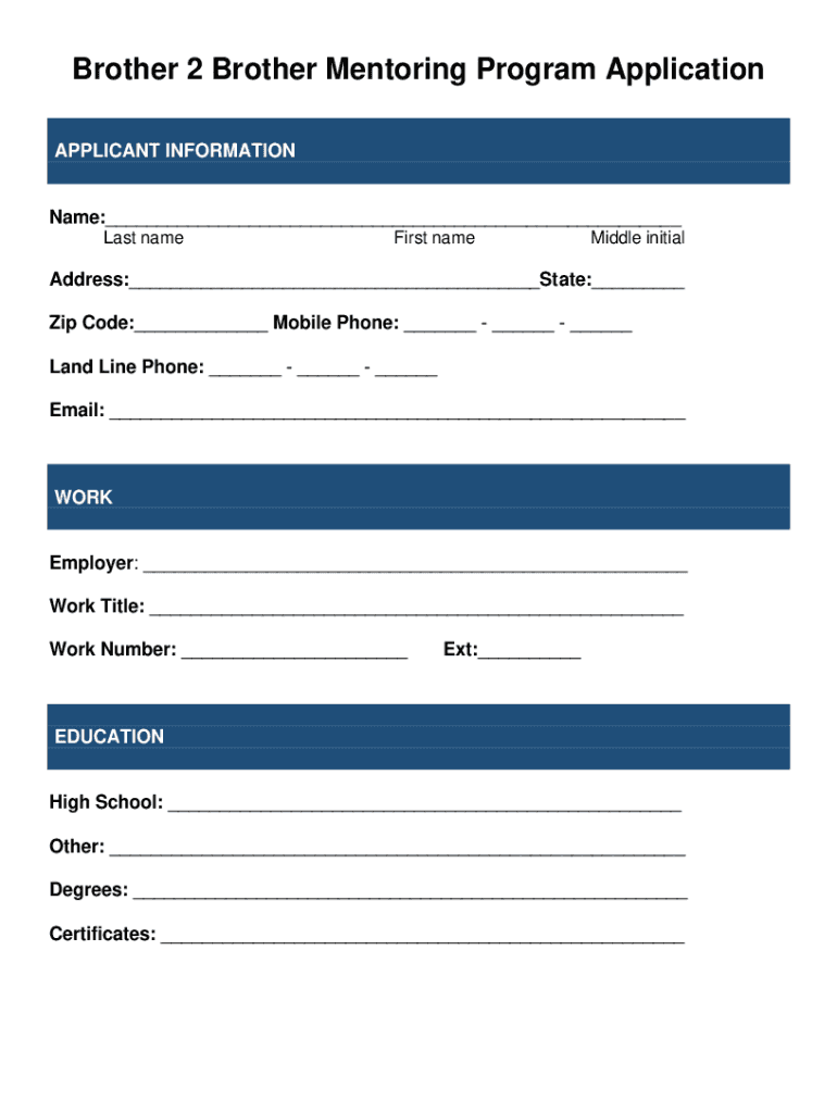 Brother 2 Brother Mentoring Program Application APPLICANT Informational:___ Last nameFirst nameMiddle initialAddress:___State:___ Zip Code:___ Mobile Phone: ___ ___ ___ Landline Phone: ___ ___ ___