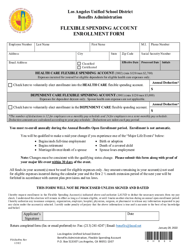 Los Angeles Unified School District Benefits AdministrationFLEXIBLE SPENDING ACCOUNT ENROLLMENT FORM Employee Numberless NameAddressFirst Name CityEmail Address. I. StateClassified Certificated Telephone