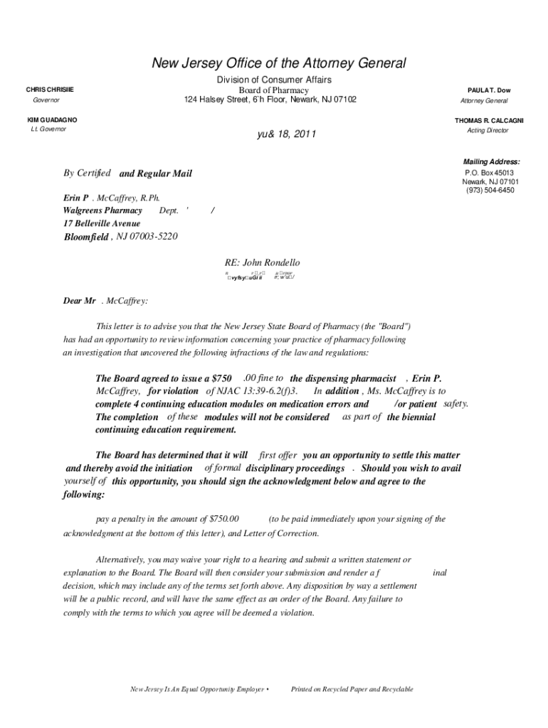 New Jersey Office of the Attorney General Division of Consumer Affairs Board of PharmacyCHRIS CHRISIIEPAULA T. Dow124 Halsey Street, 6×h Floor, Newark, NJ 07102Governor KIM GUANO Lt. GovernorAttorney