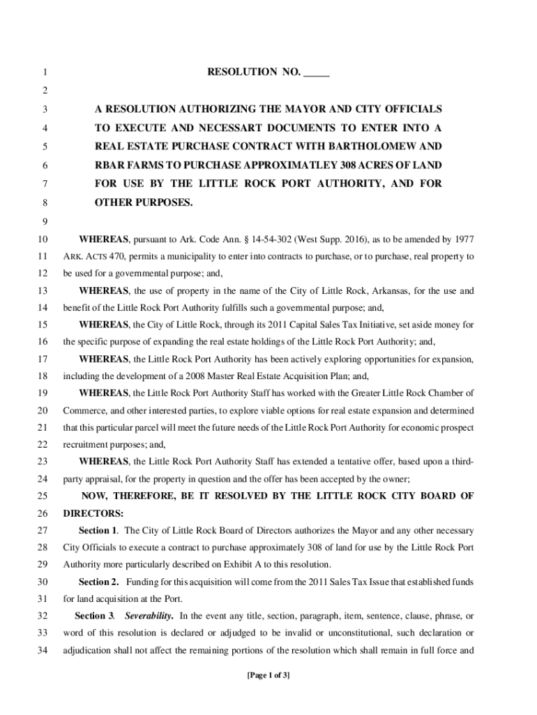RESOLUTION NO. ___1 2 3A RESOLUTION AUTHORIZING THE MAYOR AND CITY OFFICIALS4TO EXECUTE AND NECESSARY DOCUMENTS TO ENTER INTO A5REAL ESTATE PURCHASE CONTRACT WITH BARTHOLOMEW AND6RBAR FARMS TO PURCHASE