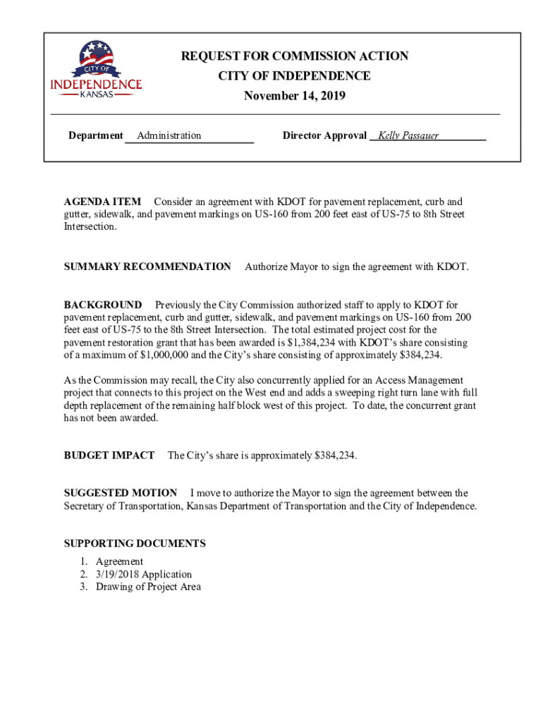 REQUEST FOR COMMISSION ACTION CITY OF INDEPENDENCE November 14, 2019, DepartmentAdministrationDirector Approval Kelly PassauerAGENDA ITEM Consider an agreement with DOT for pavement replacement, curb