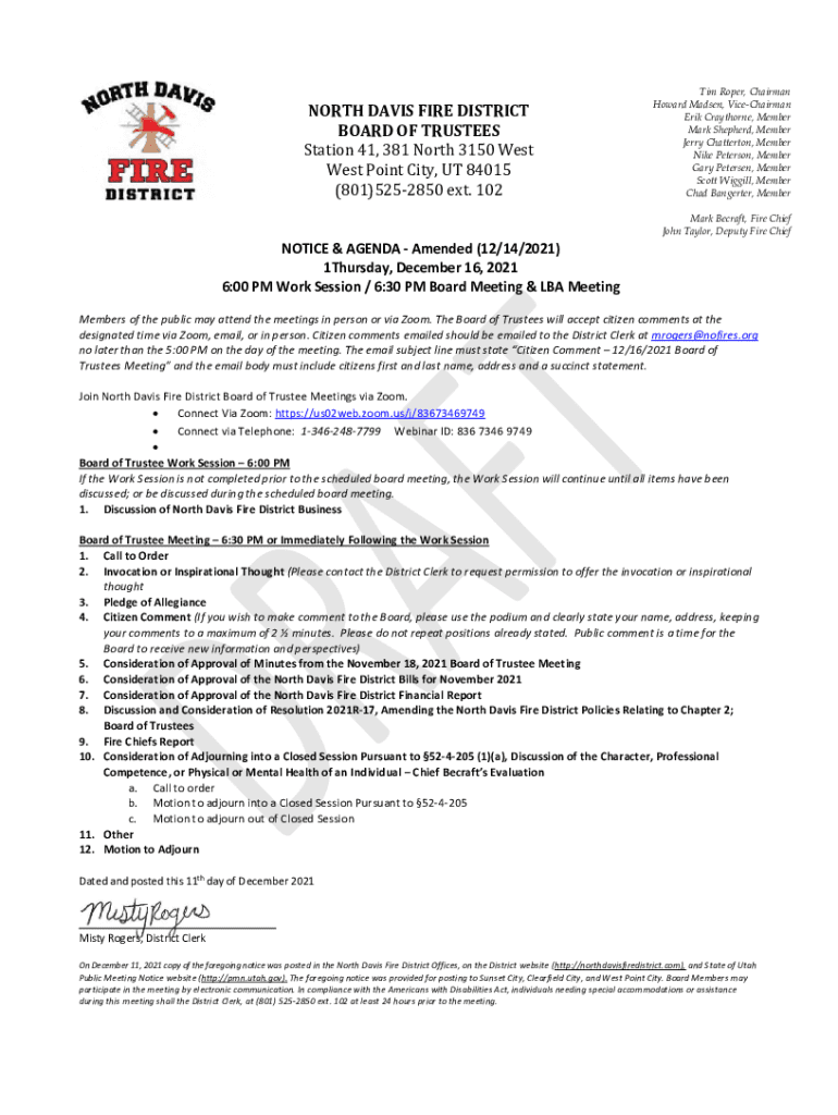 NORTH DAVIS FIRE DISTRICT BOARD OF TRUSTEES Station 41, 381 North 3150 West Point City, UT 84015 (801)5252850 ext. 102 NOTICE & AGENDA Amended (12/14/2021) 1Thursday, December 16, 2021 6:00 PM Work